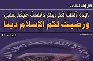 Allah telah sempurnakan agama-Nya, Islam. Ini sebagai nikmat terbesar bagi umat manusia. Sebuah ajaran yang mengeluarkan manusia dari peribadatan kepada sesamanya menuju peribadatan kepada pencipta mereka yang sebenarnya. Agama yang mengeluarkan hamba dari sempitnya dunia kepada luasnya akhirat.